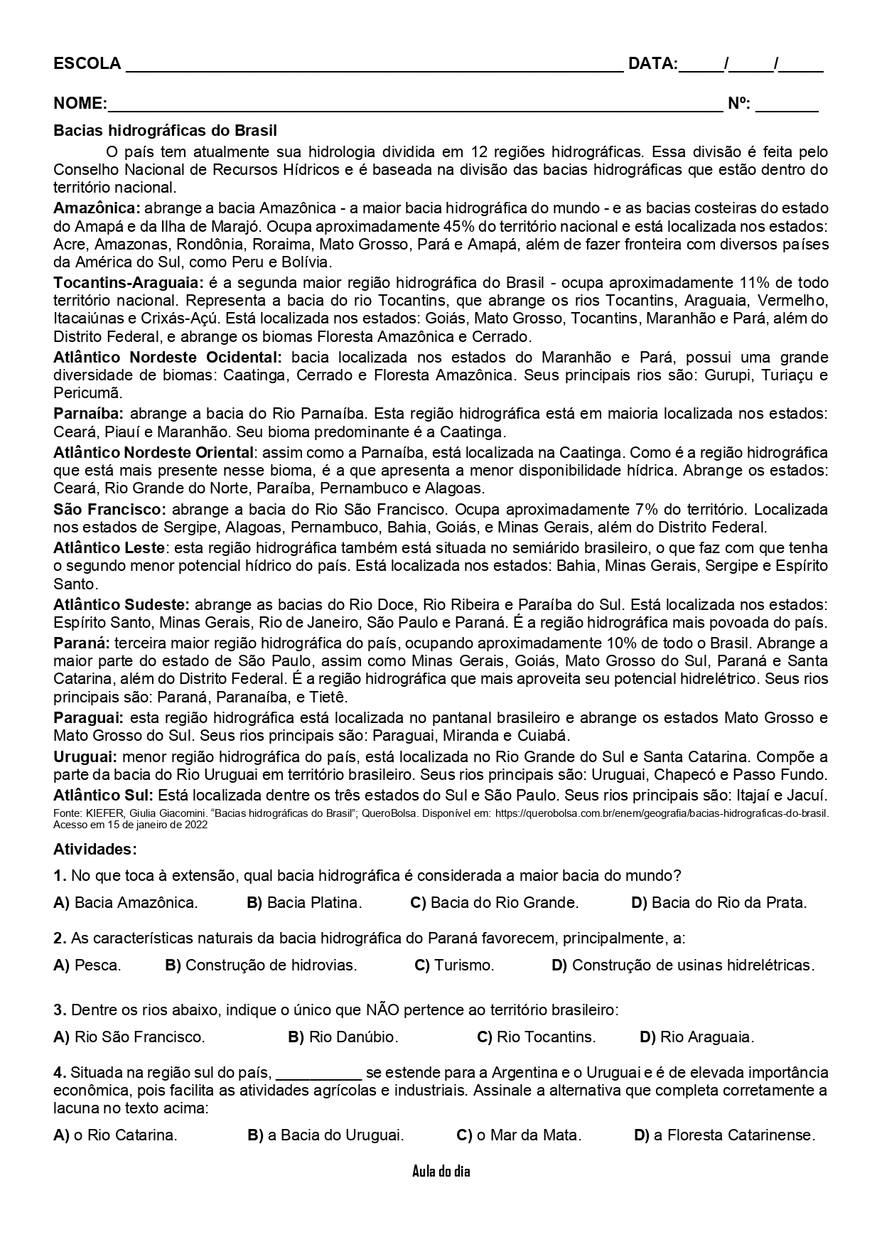 Atividade bacias hidrográficas do Brasil – questões + resumo